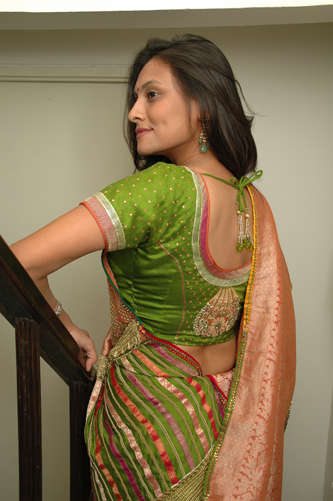 ![]() Peach Rust Banasari Saree with Multicolor Brocade Palav with Green Blouse. |