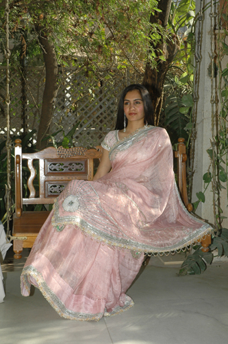 ![]() Pink Crepe Tissue Saree with White Blouse Pattikki, Resham & Nakshi Work. |