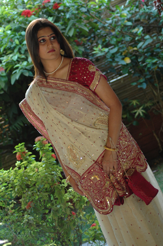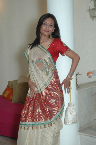 ![]() Crepe Tissue Saree with Red Brocade Palav & Red Blouse. |