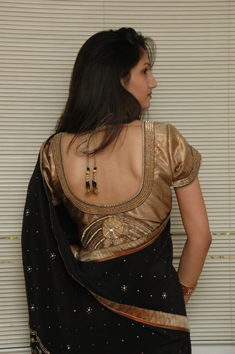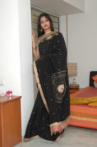 | Black Crepe Saree with Round Motif in Palav & Copper Blouse. |