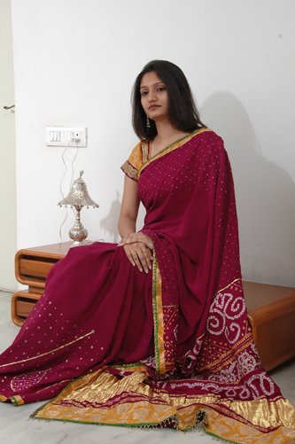 ![]() Majenta Bandhni with contrast Mustard yellow Blouse |
