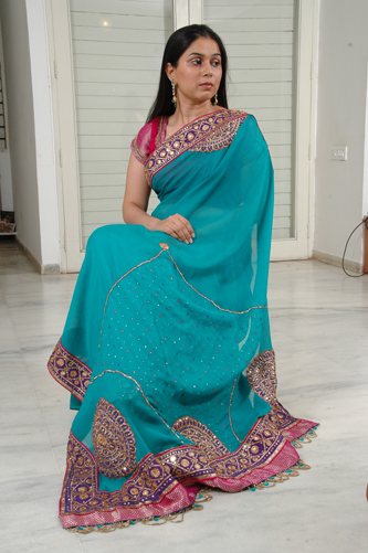 ![]() Gota patti Peacock Blue Saree with Shocking Pink Brocade Blouse |