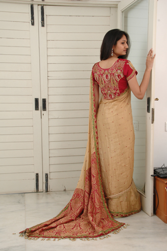 ![]() Gold Crepe Tissue Saree with majenta pink bead work blouse |