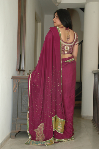 ![]() Majenta Crepe Saree with Bead Work Brocade Blouse |