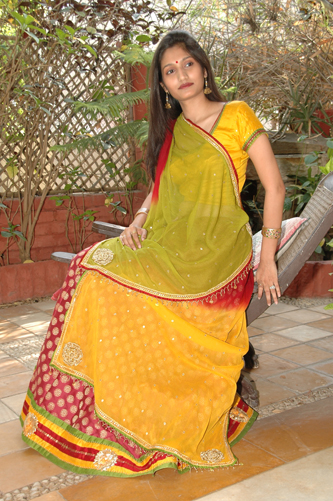 Yellow Orange Chiffon Saree with Royal Blue Blouse. |